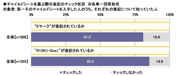 第一子のチャイルドシートを入手した方のうち、“Eマーク”“R129(i-Size)”の表記についてそれぞれ知っていた方に、チャイルドシートを選ぶ際の表記のチェック状況を聞いたところ、【“Eマーク”が表記されているか】では「チェックした」は81.0%、「チェックしなかった」は19.0%、【“R129(i-Size)”が表記されているか】では「チェックした」は85.4%、「チェックしなかった」は14.6%と、どちらの認知者においても表記を実際にチェックしたという方が大多数でした。