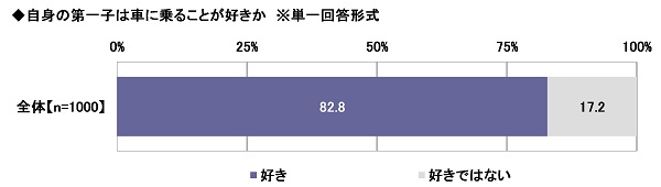 全回答者1,000名に、自身の第一子は車に乗ることが好きかを聞いたところ、「好き」は82.8%、「好きではない」は17.2%となりました。