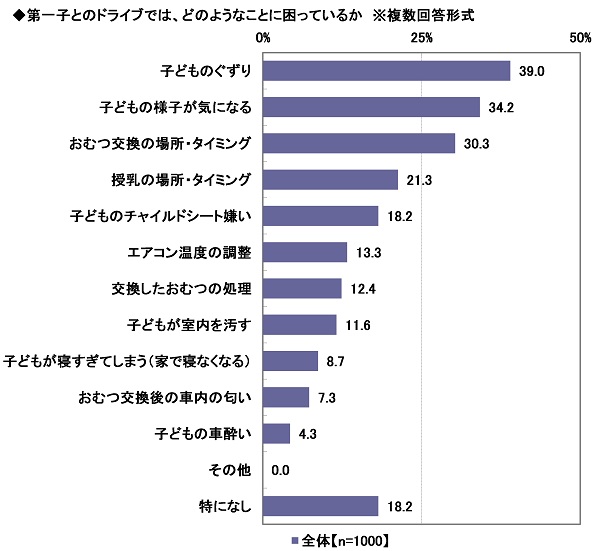 また、第一子とのドライブでは、どのようなことに困っているかを聞いたところ、「子どものぐずり」(39.0%)が最も高くなりました。ドライブ中に子どもが駄々をこね始めたり、急に機嫌が悪くなったりするなど、子どものぐずりに悩まされている方が多いようです。次いで高くなったのは、「子どもの様子が気になる」(34.2%)、「おむつ交換の場所・タイミング」(30.3%)、「授乳の場所・タイミング」(21.3%)、「子どものチャイルドシート嫌い」(18.2%)でした。