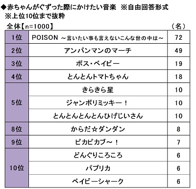全回答者1,000名に、赤ちゃんがぐずった際にかけたい音楽を聞いたところ、「POISON ~言いたい事も言えないこんな世の中は~」(72名)が1位となりました。俳優・反町隆史さんが1998年にリリースした曲で、しばらく経ってから“赤ちゃんが泣き止む曲”としても注目されました。次いで、2位「アンパンマンのマーチ」(49名)、3位「ボス・ベイビー」(19名)、4位「とんとんトマトちゃん」(18名)、5位「きらきら星」「ジャンボリミッキー!」「とんとんとんとんひげじいさん」(いずれも10名)と、アニメや映画の音楽、手遊び歌が上位に挙がりました。