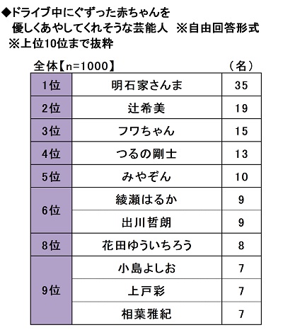 ドライブ中にぐずった赤ちゃんを優しくあやしてくれそうな芸能人を聞いたところ、1位「明石家さんまさん」(35名)、2位「辻希美さん」(19名)、3位「フワちゃん」(15名)、4位「つるの剛士さん」(13名)、5位「みやぞんさん」(10名)となりました。