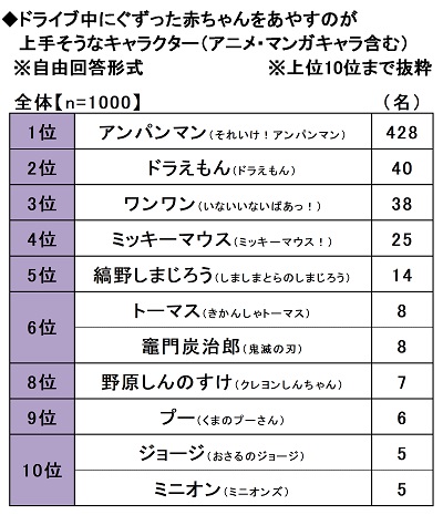また、ドライブ中にぐずった赤ちゃんをあやすのが上手そうなキャラクター(アニメ・マンガキャラ含む)を聞いたところ、「アンパンマン(それいけ!アンパンマン)」(428名)がダントツとなり、2位「ドラえもん(ドラえもん)」(40名)、3位「ワンワン(いないいないばあっ!)」(38名)、4位「ミッキーマウス(ミッキーマウス!)」(25名)、5位「縞野しまじろう(しましまとらのしまじろう)」(14名)と続きました。