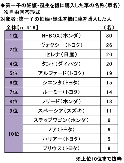 次に、第一子の妊娠・誕生を機に車を購入した方416名に、購入した車の名称(車名)を聞いたところ、1位「N-BOX(ホンダ)」(30名)、2位「ヴォクシー(トヨタ)」「セレナ(日産)」(いずれも26名)、4位「タント(ダイハツ)」(20名)、5位「アルファード(トヨタ)」(19名)と、スライドドアが搭載された車や車内空間の広い車が多く挙がる結果となりました。