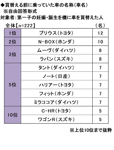 また、第一子の妊娠・誕生を機に車を買替えた方222名に、買替える前に乗っていた車の名称(車名)を聞いたところ、1位「プリウス(トヨタ)」(12名)、2位「N-BOX(ホンダ)」(10名)、3位「ムーヴ(ダイハツ)」「ラパン(スズキ)」(いずれも8名)、5位「タント(ダイハツ)」「ノート(日産)」「ハリアー(トヨタ)」「フィット(ホンダ)」「ミラココア(ダイハツ)」(いずれも7名)と、“第一子の妊娠・誕生を機に購入した車”と異なり、コンパクトカーや軽自動車がTOP5に複数ランクインしました。