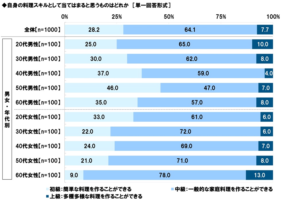 はじめに、全回答者(1,000名)に、自身の料理スキルとして当てはまると思うものはどれか聞いたところ、「初級:簡単な料理を作ることができる」は28.2%、「中級:一般的な家庭料理を作ることができる」は64.1%、「上級:多種多様な料理を作ることができる」は7.7%と、中級が最も高くなりました。