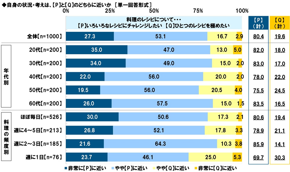 料理のレシピについて、いろいろなレシピにチャレンジしたいか、ひとつのレシピを極めたいか聞いたところ、『いろいろなレシピにチャレンジしたい(計)』は80.4%、『ひとつのレシピを極めたい(計)』は19.6%と、いろいろなレシピにチャレンジしたい派の人が大半でした。