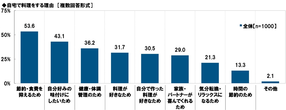 全回答者(1,000名)に、自宅で料理をする理由を聞いたところ、「節約・食費を抑えるため」(53.6%)が半数以上で最も高く、「自分好みの味付けにしたいため」(43.1%)、「健康・体調管理のため」(36.2%)、「料理が好きなため」(31.7%)、「自分で作った料理が好きなため」(30.5%)が続きました。