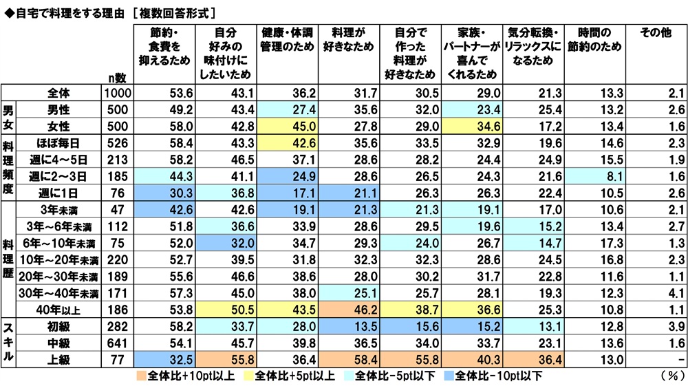 料理スキル別に見ると、上級の人では1位「料理が好きなため」(58.4%)、2位「自分好みの味付けにしたいため」「自分で作った料理が好きなため」(いずれも55.8%)となりました。