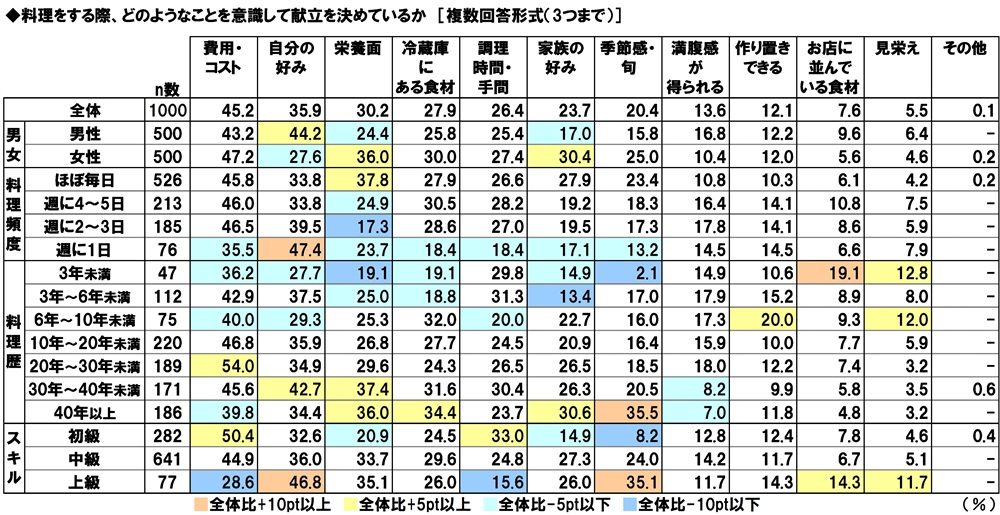 料理スキル別に見ると、上級の人では1位「自分の好み」(46.8%)、2位「栄養面」「季節感・旬」(いずれも35.1%)でした。料理スキルが上級の人では、コストや効率面ではなく、料理の出来栄えや満足度を重視している人が多いようです。