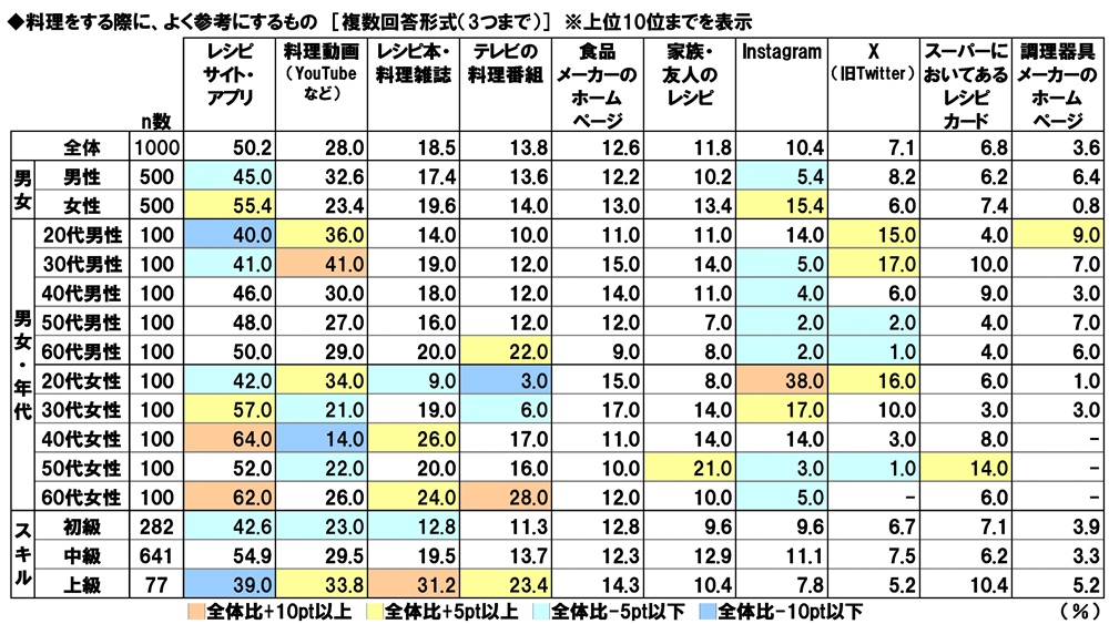 男女・年代別に見ると、60代女性では2位は「テレビの料理番組」(28.0%)でした。20代女性では2位は「Instagram」(38.0%)となりました。また、「X(旧Twitter)」は男女ともに20代と30代(20代男性15.0%、30代男性17.0%、20代女性16.0%、30代女性10.0%)で他の年代より高くなる傾向がみられました。20代女性ではXやInstagramといったSNSを参考に料理をすることが多いようです。