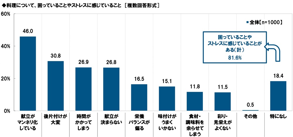 全回答者(1,000名)に、料理について、困っていることやストレスに感じていることを聞いたところ、「献立がマンネリ化している」(46.0%)が最も高くなり、「後片付けが大変」(30.8%)、「時間がかかってしまう」(26.9%)、「献立が決まらない」(26.8%)、「栄養バランスが偏る」(16.5%)が続きました。また、困っていることやストレスに感じていることがある人の割合は81.6%となり、大多数が料理に関する悩み・ストレスを感じていることが分かりました。