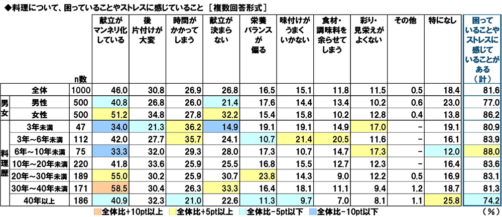 男女別に見ると、「献立がマンネリ化している」(男性40.8%、女性51.2%)、「献立が決まらない」(男性21.4%、女性32.2%)は、女性が男性と比較して10ポイント以上高くなりました。