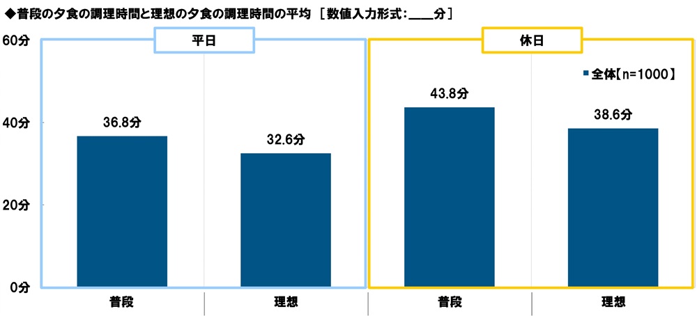 全回答者(1,000名)に、平日と休日について、それぞれ普段の夕食の調理時間と理想の夕食の調理時間を聞きました。