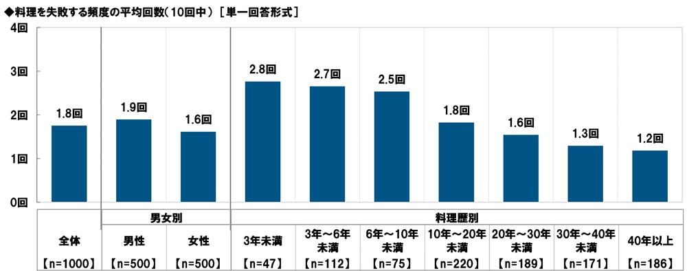 また、どのくらいの頻度で料理を失敗しているか(10回中何回失敗するか)聞いたところ、平均は1.8回となりました。
