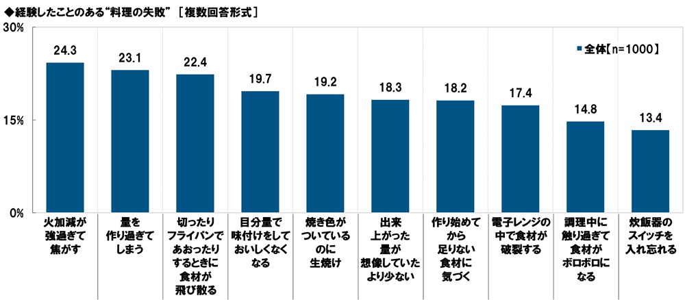 全回答者(1,000名)に、経験したことのある“料理の失敗”を聞いたところ、1位「火加減が強過ぎて焦がす」(24.3%)、2位「量を作り過ぎてしまう」(23.1%)、3位「切ったりフライパンであおったりするときに食材が飛び散る」(22.4%)、4位「目分量で味付けをしておいしくなくなる」(19.7%)、5位「焼き色がついているのに生焼け」(19.2%)となりました。