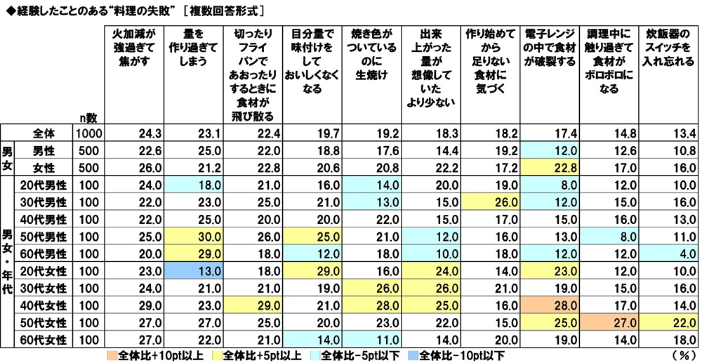 男女・年代別に見ると、30代男性では「作り始めてから足りない食材に気づく」(26.0%)、20代女性では「目分量で味付けをしておいしくなくなる」(29.0%)、30代女性では「焼き色がついているのに生焼け」「出来上がった量が想像していたより少ない」(いずれも26.0%)、50代女性では「火加減が強過ぎて焦がす」「量を作り過ぎてしまう」「調理中に触り過ぎて食材がボロボロになる」(いずれも27.0%)が1位となりました。