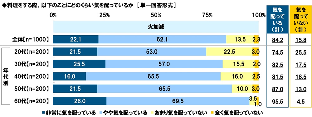 【火加減】について見ると、『気を配っている(計)』が84.2%、『気を配っていない(計)』が15.8%となり、大多数が火加減に気を配りながら料理をしていることがわかりました。