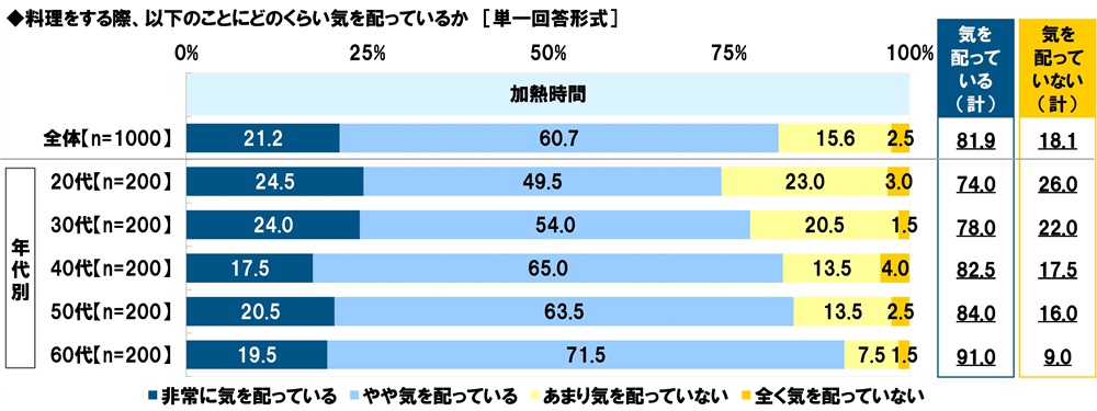 【加熱時間】について見ると、『気を配っている(計)』が81.9%、『気を配っていない(計)』が18.1%となりました。