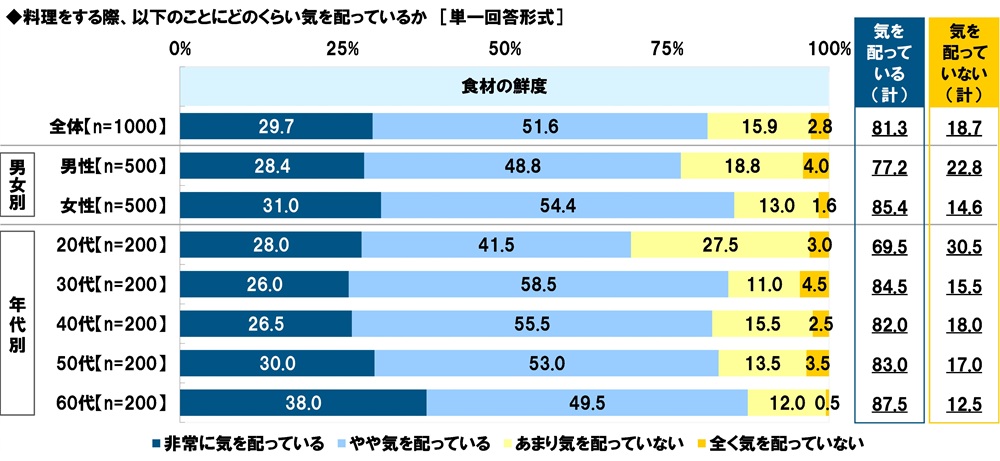 【食材の鮮度】について見ると、『気を配っている(計)』が81.3%、『気を配っていない(計)』が18.7%となりました。