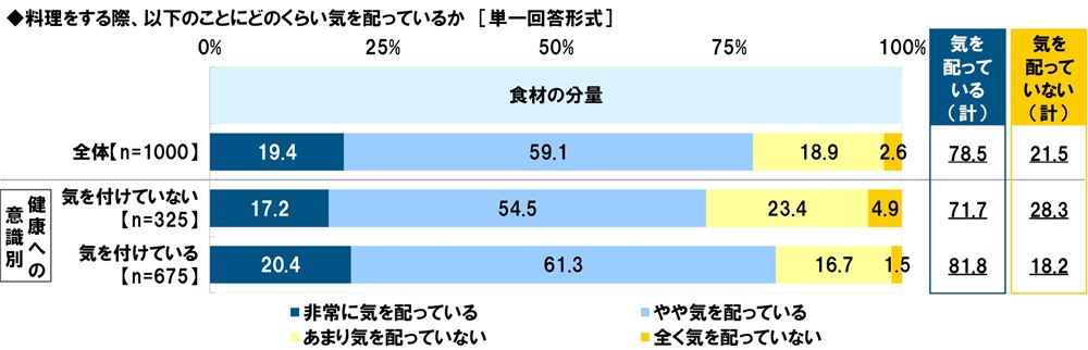 【食材の分量】について見ると、『気を配っている(計)』が78.5%、『気を配っていない(計)』が21.5%となりました。