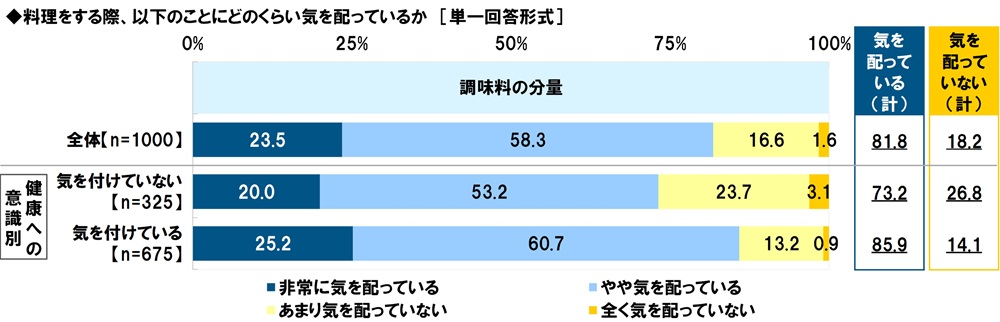 【調味料の分量】について見ると、『気を配っている(計)』が81.8%、『気を配っていない(計)』が18.2%となりました。