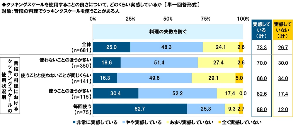 普段の料理におけるクッキングスケールの使用状況別に見ると、毎回使う人では『実感している(計)』は88.0%でした。また、毎回使う人では「非常に実感している」(62.7%)の割合が突出して高くなりました。