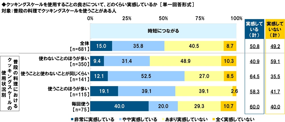 普段の料理におけるクッキングスケールの使用状況別に見ると、『実感している(計)』の割合は、使うことと使わないことが同じくらいの人で最も高くなっており64.5%でした。また、「非常に実感している」の割合は使う頻度が多くなるにつれて高くなっており、毎回使う人では40.0%でした。使う頻度が高い人ほど、料理の時短や効率化を図ることができるというクッキングスケールの利便性を強く感じていることがうかがえます。