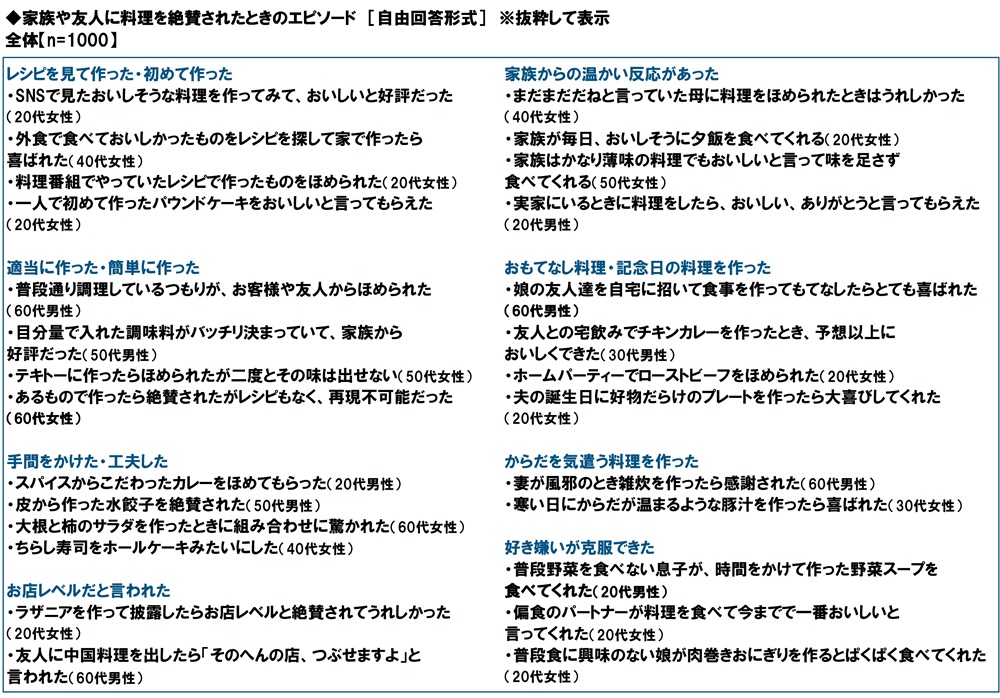 全回答者(1,000名)に、家族や友人に料理を絶賛されたときのエピソードを聞いたところ、「SNSで見たおいしそうな料理を作ってみて、おいしいと好評だった」、「一人で初めて作ったパウンドケーキをおいしいと言ってもらえた」といったレシピを見て作った料理や初挑戦の料理がほめられたエピソードや、「目分量で入れた調味料がバッチリ決まっていて、家族から好評だった」、「テキトーに作ったらほめられたが二度とその味は出せない」といった簡単に作った料理が思いのほか好評だったというエピソードが挙げられました。また、「スパイスからこだわったカレーをほめてもらった」、「娘の友人達を自宅に招いて食事を作ってもてなしたらとても喜ばれた」といった手間をかけた料理やおもてなし料理が喜ばれたエピソードや、「妻が風邪のとき雑炊を作ったら感謝された」、「寒い日にからだが温まるような豚汁を作ったら喜ばれた」といったからだを気遣う料理に関するエピソード、「家族が毎日、おいしそうに夕飯を食べてくれる」、「普段野菜を食べない息子が、時間をかけて作った野菜スープを食べてくれた」といった、言葉ではなく食べた人の反応から料理への評価が伝わってくるエピソードもみられました。