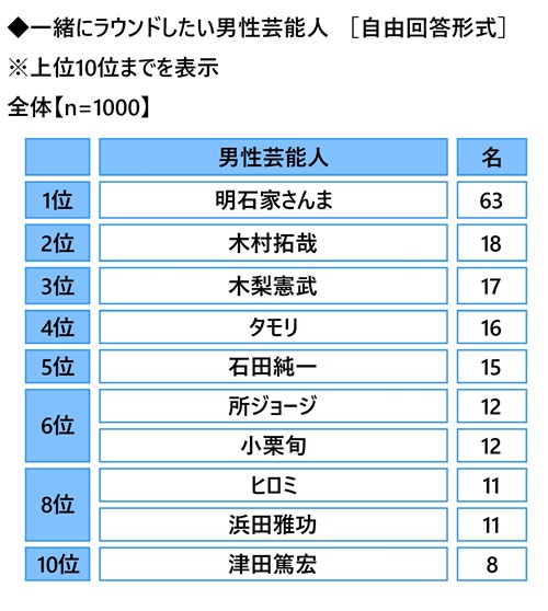 一緒にラウンドしたい男性芸能人を聞いたところ、「明石家さんまさん」(63名)がダントツとなり、2位「木村拓哉さん」(18名)、3位「木梨憲武さん」(17名)、4位「タモリさん」(16名)、5位「石田純一さん」(15名)と続きました。
