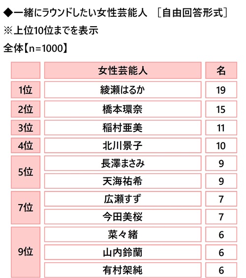 一緒にラウンドしたい女性芸能人を聞いたところ、1位「綾瀬はるかさん」(19名)、2位「橋本環奈さん」(15名)、3位「稲村亜美さん」(11名)、4位「北川景子さん」(10名)、5位「長澤まさみさん」「天海祐希さん」(いずれも9名)となりました。