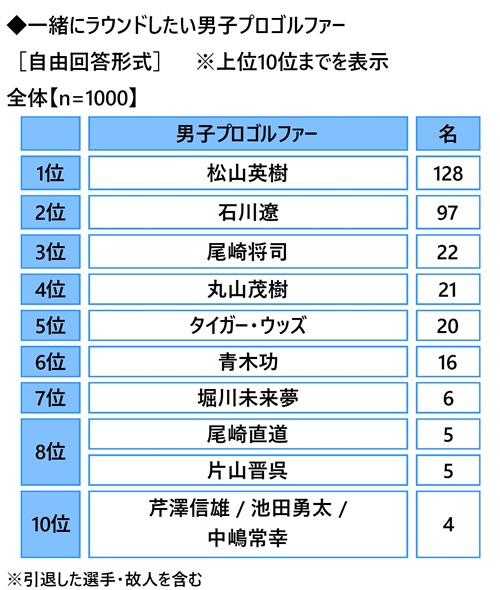一緒にラウンドしたい男子プロゴルファー 1位「松山英樹さん」2位「石川遼さん」3位「尾崎将司さん」