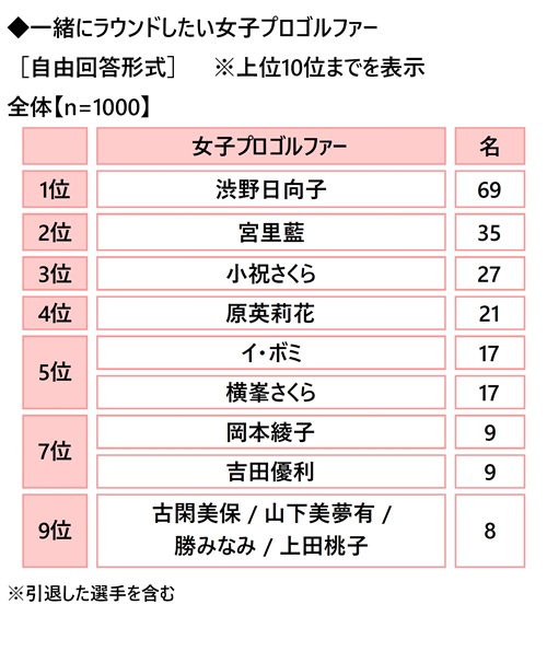 一緒にラウンドしたい女子プロゴルファーをみると、1位「渋野日向子さん」(69名)、2位「宮里藍さん」(35名)、3位「小祝さくらさん」(27名)、4位「原英莉花さん」(21名)、5位「イ・ボミさん」「横峯さくらさん」(いずれも17名)となりました。