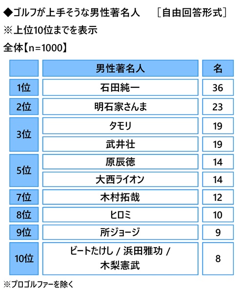 ゴルフが上手そうな男性著名人をみると、1位「石田純一さん」(36名)、2位「明石家さんまさん」(23名)、3位「タモリさん」「武井壮さん」(いずれも19名)、5位「原辰徳さん」「大西ライオンさん」(いずれも14名)となりました。