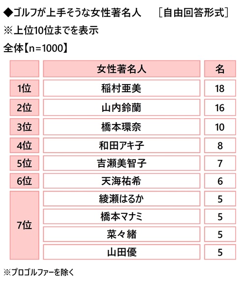 ゴルフが上手そうな女性著名人をみると、1位「稲村亜美さん」(18名)、2位「山内鈴蘭さん」(16名)、3位「橋本環奈さん」(10名)、4位「和田アキ子さん」(8名)、5位「吉瀬美智子さん」(7名)となりました。